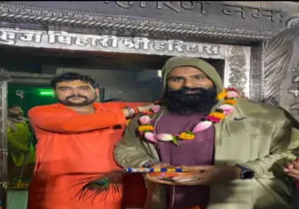 मथुरा। वर्ल्ड रेसलर रिंकू सिंह राजपूत उर्फ वीर महान बुधवार को सुबह मथुरा के वृंदावन में स्थित विश्व प्रसिद्ध बांके बिहारी मंदिर पहुंचे। यहां उन्होंने मंदिर खुलने के साथ ही दर्शन किए। इससे पहले उन्होंने मंदिर में देहरी पूजन किया। उत्तर प्रदेश के रिंकू सिंह राजपूत रेसलिंग में नाम कमाकर अमेरिका तक झंडे गाड़ चुके हैं।रिंकू सिंह राजपूत उर्फ वीर महान बुधवार की सुबह साधारण भक्तों की तरह भगवान बांके बिहारी जी के दर्शन करने पहुंचे। यहां उन्होंने मंदिर के पुजारी मयंक गोस्वामी उर्फ बंटू महाराज के साथ दर्शन किए। उन्होंने दर्शन करने से पहले गर्भ गृह की देहरी पूजा की। मयंक गोस्वामी ने उनको विधि विधान से पूजा कराई। इसके बाद उन्होंने देहरी पर इत्र की मालिश की। रिंकू सिंह राजपूत उर्फ वीर महान बांके बिहारी मंदिर में आधा घंटे तक रहे। इस दौरान मयंक गोस्वामी ने उनको भगवान का प्रसादी वस्त्र,माला और प्रसाद भेंट किया। दर्शन करने आए भक्तों को जब पता चला कि रिंकू सिंह राजपूत दर्शन करने आए हैं तो वह उनके साथ एक सेल्फी लेने लगे। फैंस को बढ़ता देख रिंकू सिंह राजपूत मंदिर से चले गए। दर्शन करने के बाद रिंकू सिंह राजपूत उर्फ वीर महान ने भगवान बांके बिहारी जी को प्रणाम किया। इस दौरान उन्होंने कहा कि वह आज जो भी कुछ हैं वह भगवान बांके बिहारी,राम और भोले नाथ की कृपा से हैं। भगवान बांके बिहारी की उन पर असीम कृपा है वह बांके बिहारी के भक्त हैं।उत्तर प्रदेश के भदोई जिले के रहने वाले रिंकू सिंह राजपूत पर उस समय लोगों को नाज हुआ जब उन्होंने 2022 में वर्ल्ड रेसलिंग इंटरटेनमेंट का खिताब अपने नाम किया। 8 अगस्त 1988 को जन्मे रिंकू सिंह राजपूत सोशल मीडिया पर काफी फेमस हैं। माथे पर त्रिपुंड,गले में रुद्राक्ष की माला और बाजू पर श्रीराम का नाम वाला वीर महान का लुक उनके फैंस को आकर्षित करता है।
