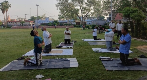 प्रशिक्षक शंन्नो शुक्ला द्वारा गाँधी पार्क मे कराया गया योगाभ्यास